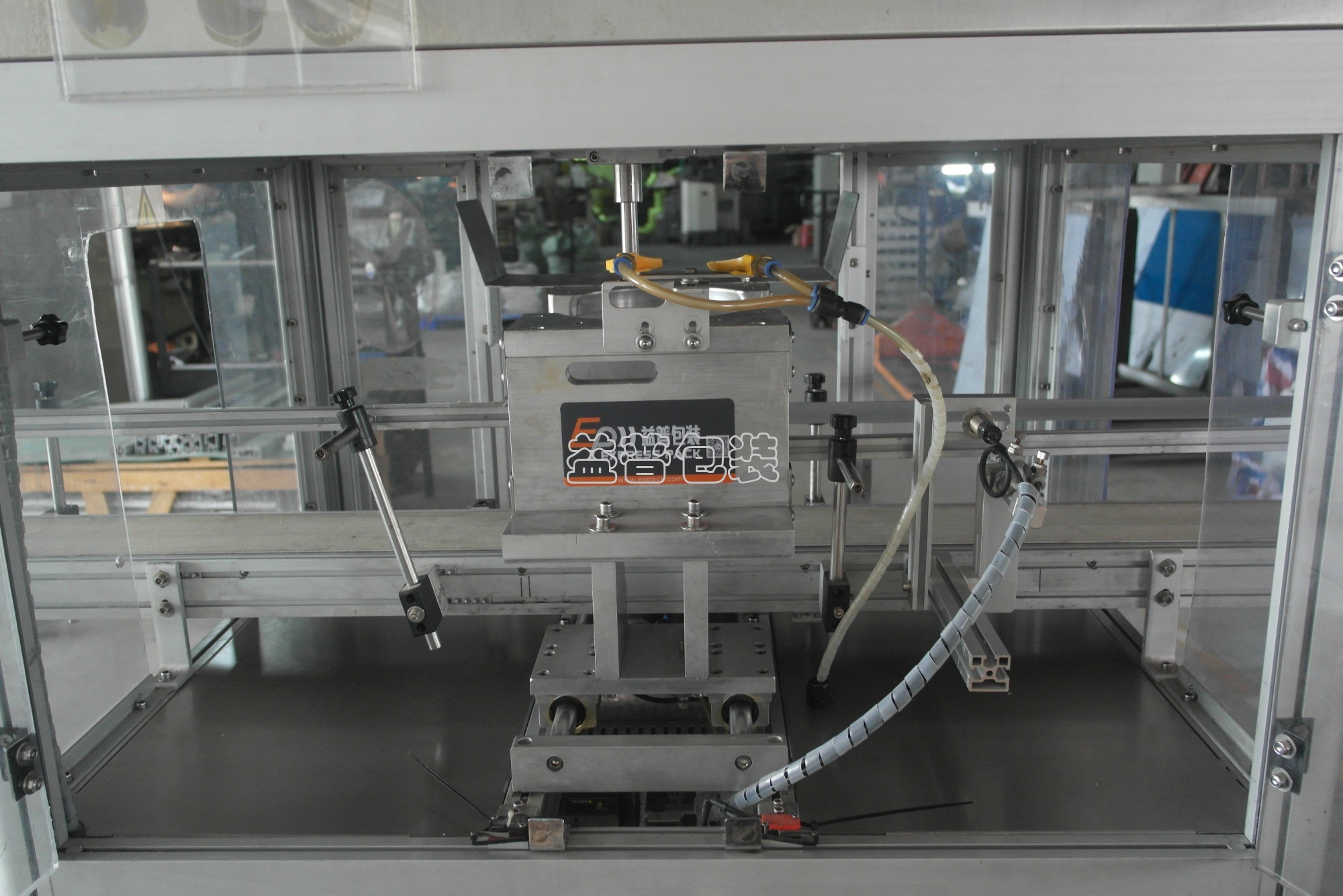 瓶子通過輸送帶進入到切口工位,通過氣缸抱夾固定瓶身,切刀下降至葫蘆口,電機帶動旋轉360°切除葫蘆口廢料;最后用氣嘴將葫蘆口廢料剔除。(廢料自行安排收集筐)
